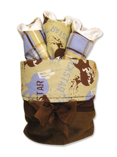 Trend Lab's Gift Cake is the perfect shower centerpiece and a practical gift for any mom to be. Gift set contains one blanket and three bibs. Blanket features blue and brown guitars with music note and splash accents on a tan cotton background with soft brown velour on the reverse. Bibs each have fun modern printed cotton on the front with terry on the back. Bib patterns include: blue and brown guitar with music note print and two with a brown blue tan and orange plaid print. Blanket is wrapped around all three bibs to resemble a cake with topper and packaged in clear cellophane with ribbon and gift tag.